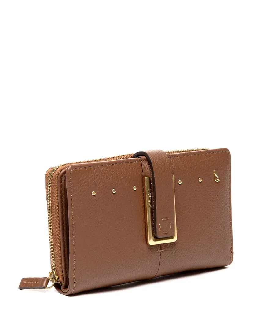 ארנק עור לנשים מעור נאפה קוניאק בעיצוב יוקרתי עם אביזרי זהב.