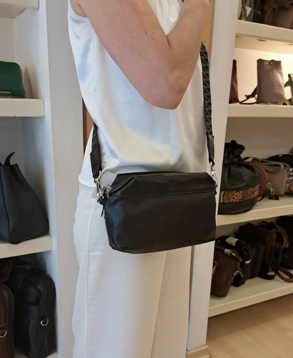 דגם אנג'י סיטי בצבע שחור עוצמתי משלב עור נאפה חלק עם טקסטורת קשקשים יוקרתית,