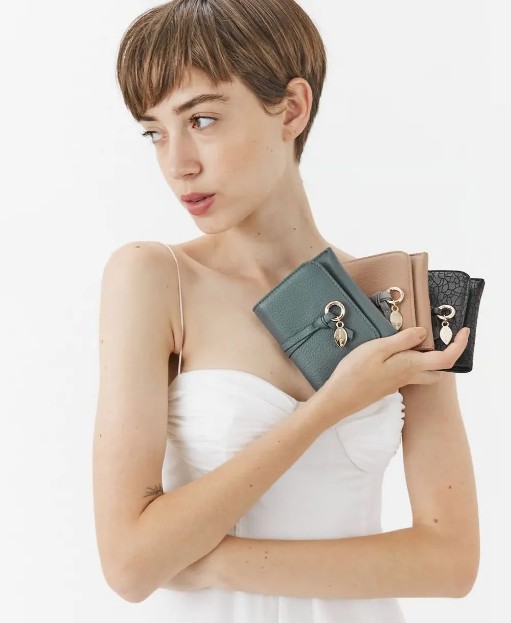 ארנק מעור נאפה איכותי לנשים בעיצוב אלגנטי עם תליון עלה מוזהב.