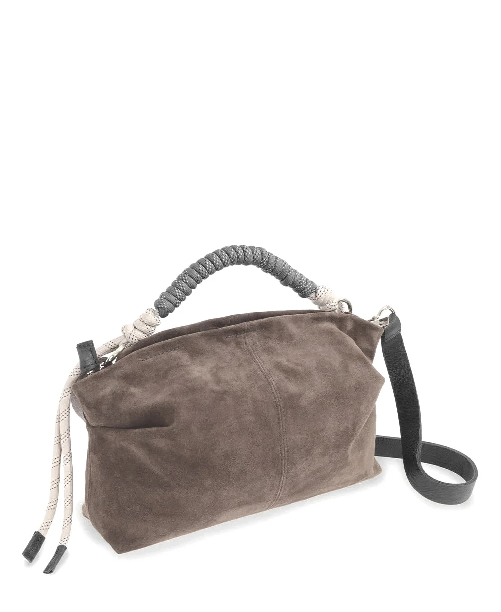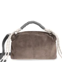 תיק צד לנשים מעצבת נטע שדה – דגם "בודהה" בעור זמש חום אפרפר