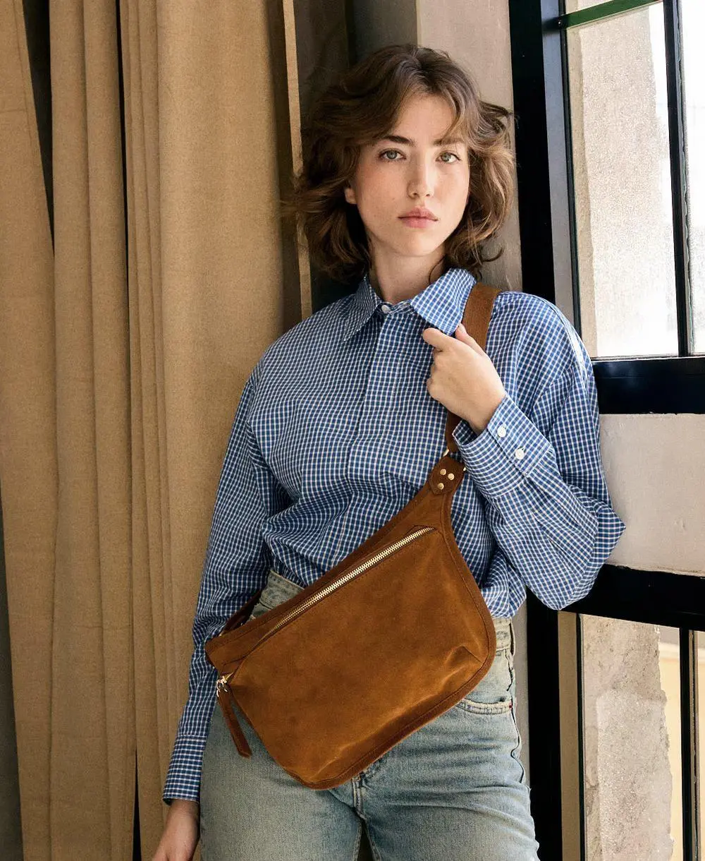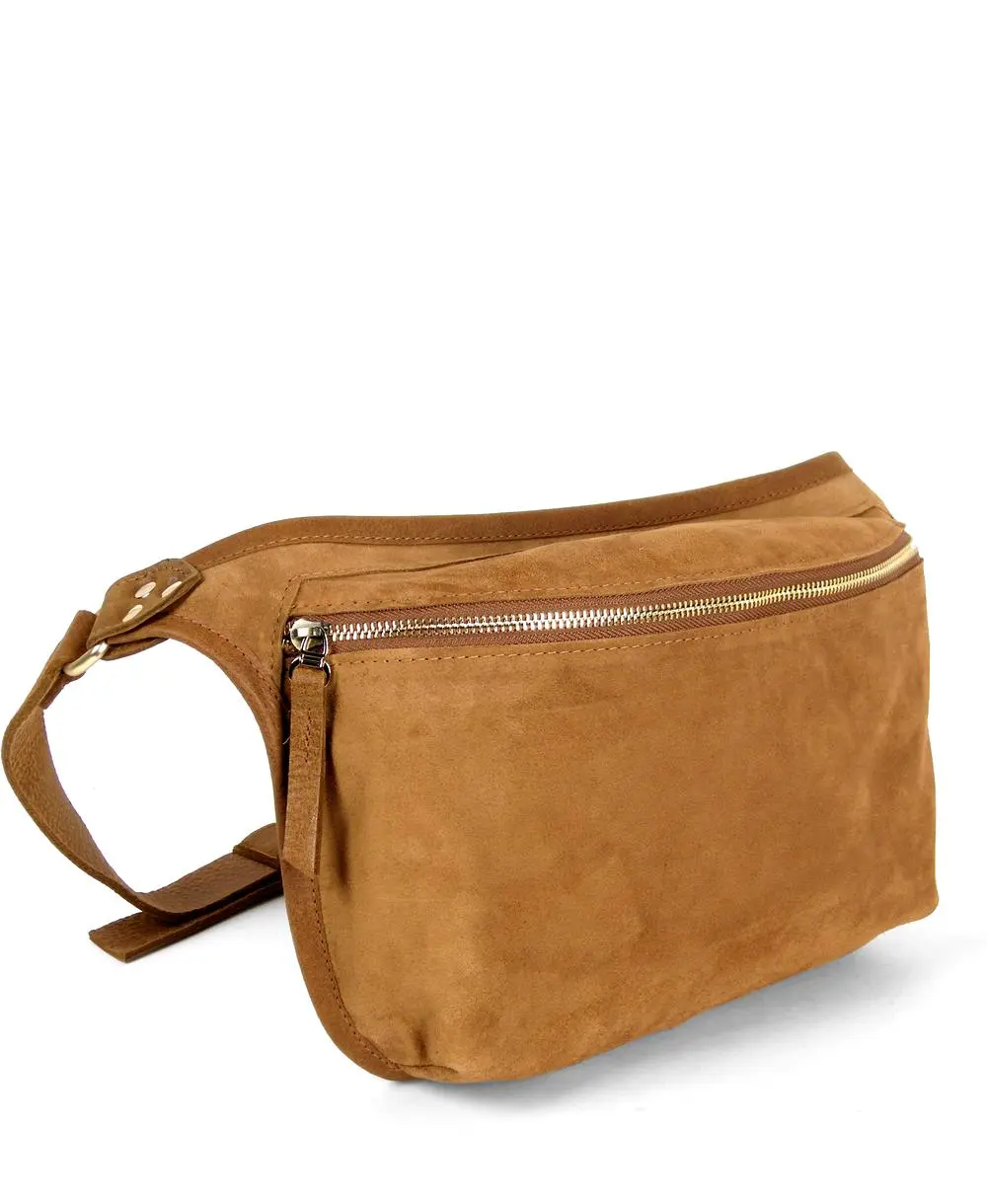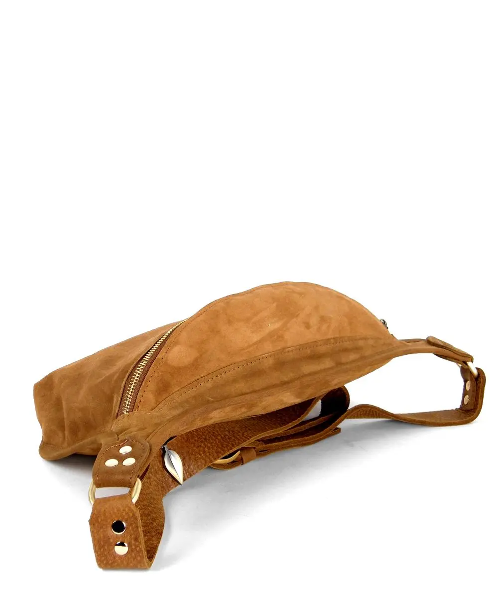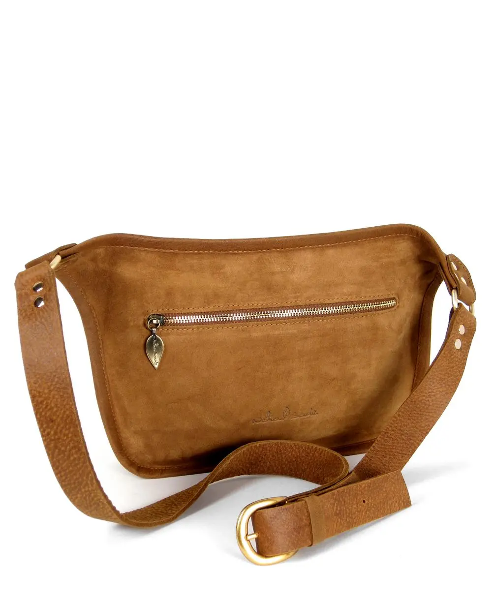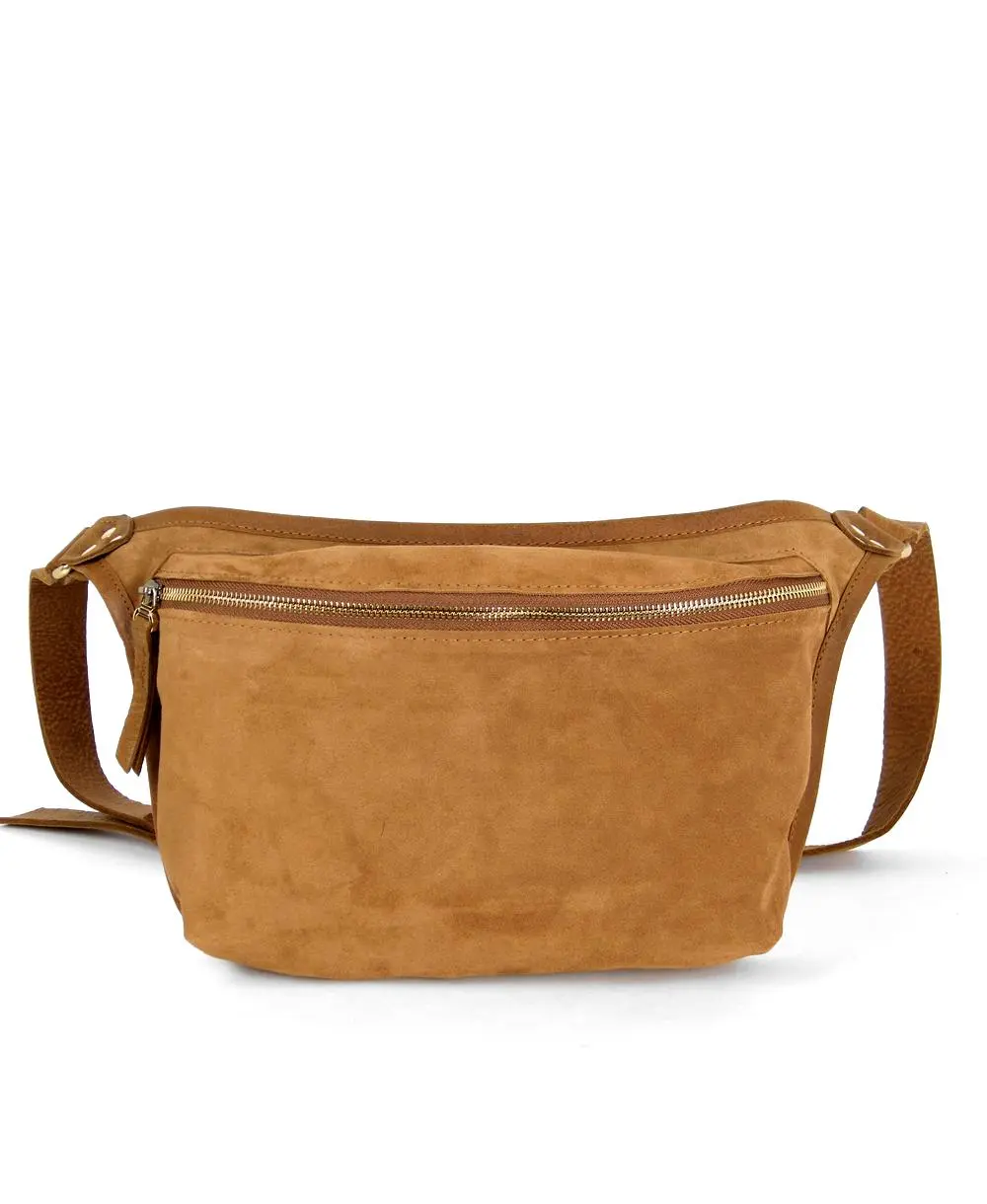 עשוי מעור זמש רך בגוון חום בהיר, עם רצועת כתף ארוכה ומתכווננת