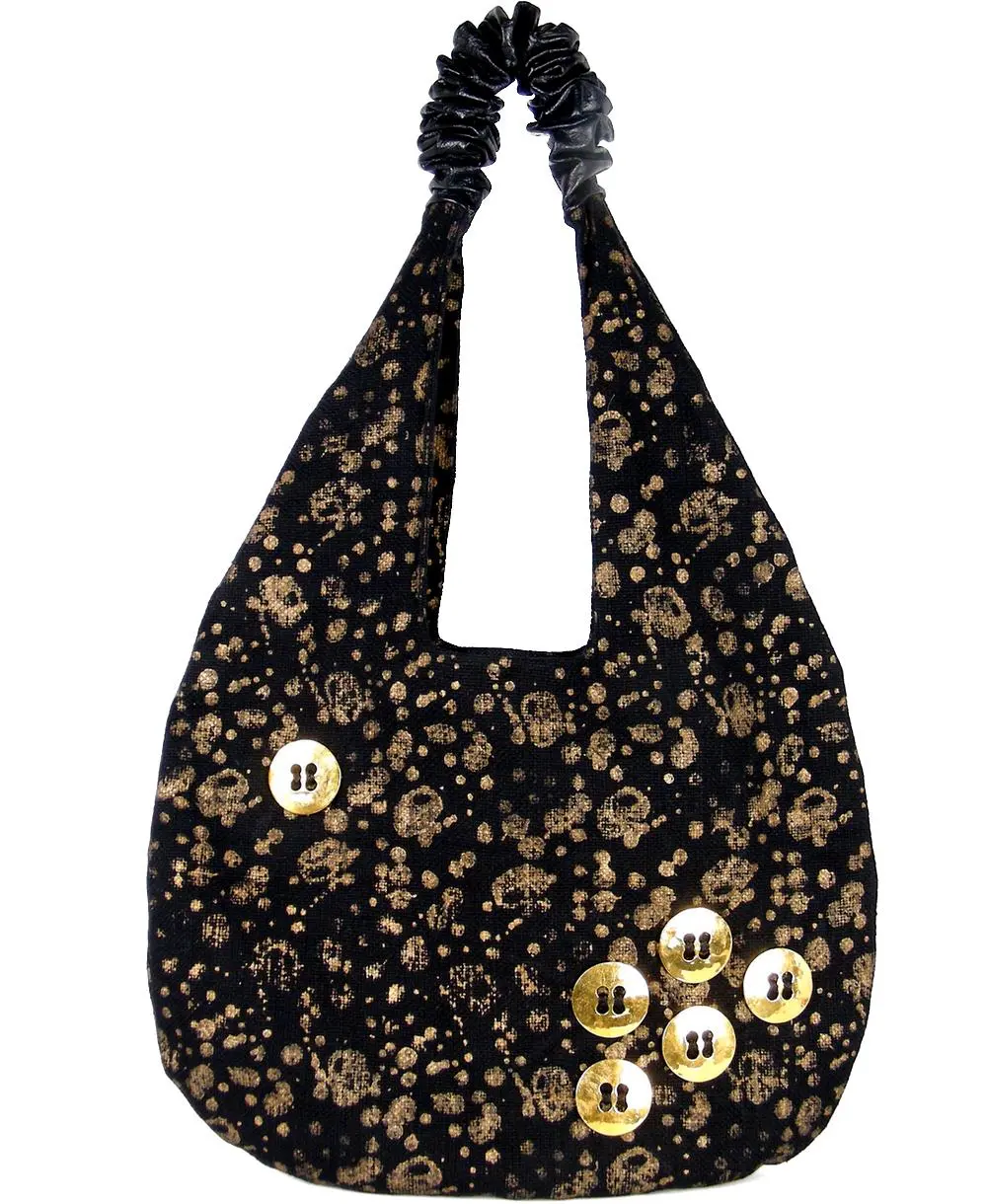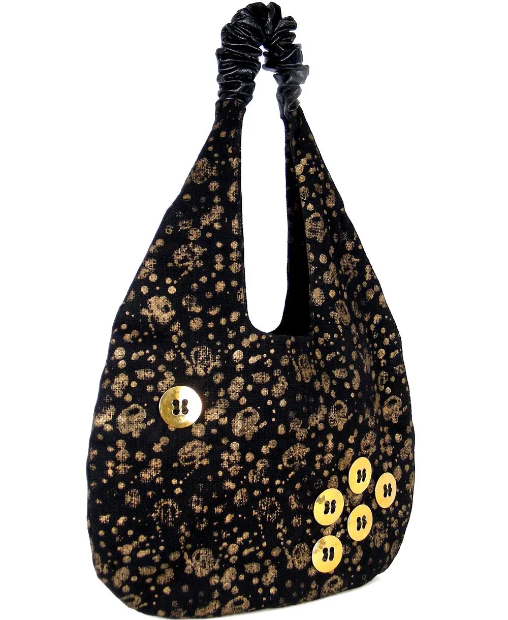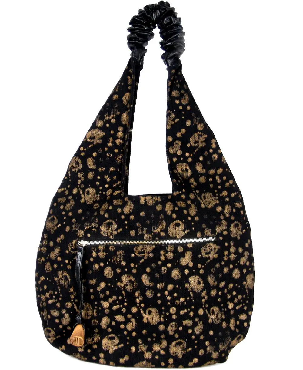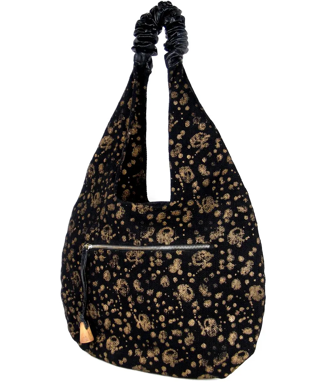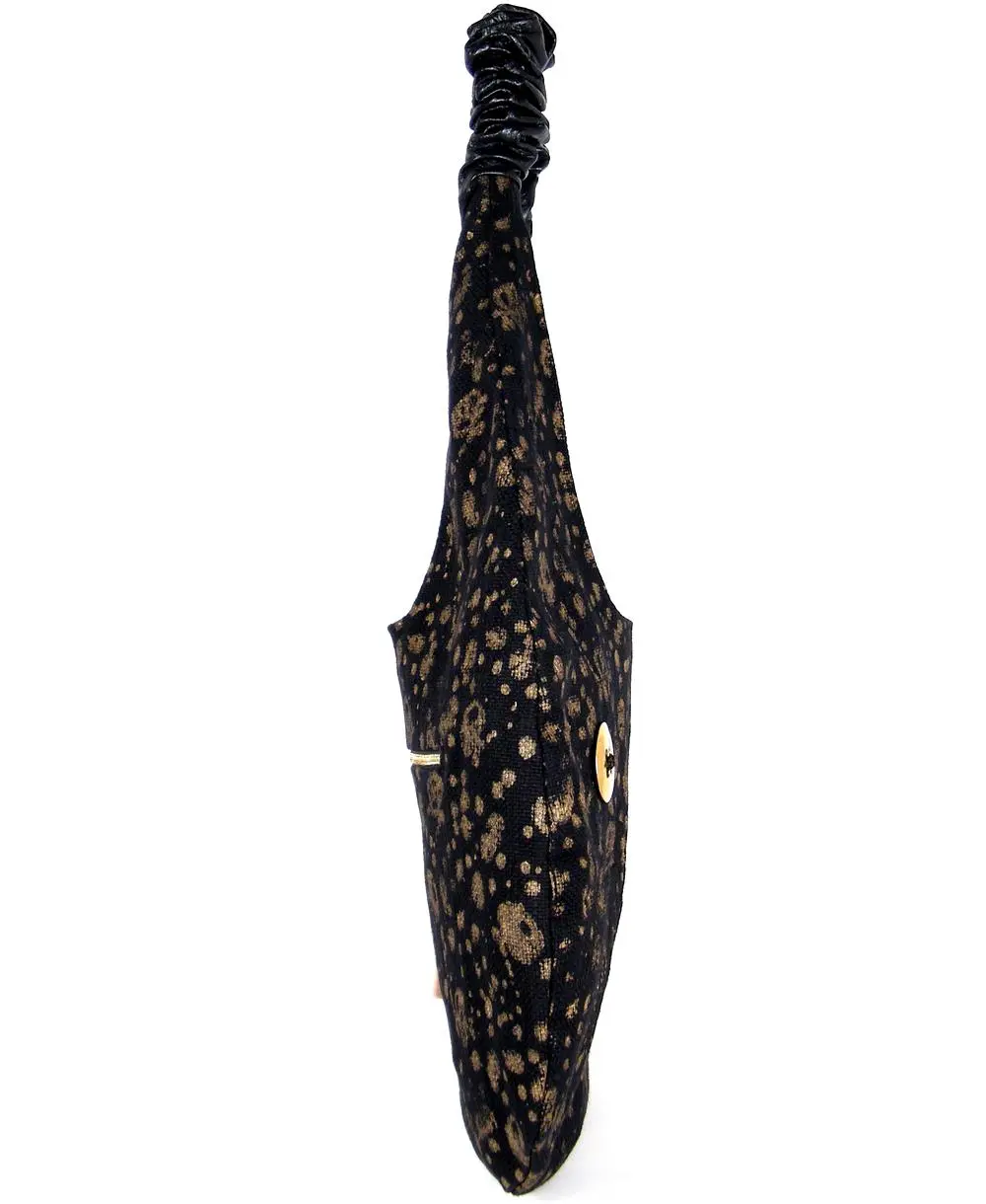 החלק העליון עשוי עור נאפה מקומט, בסיס התיק מבד שחור עם הדפסים בזהב.