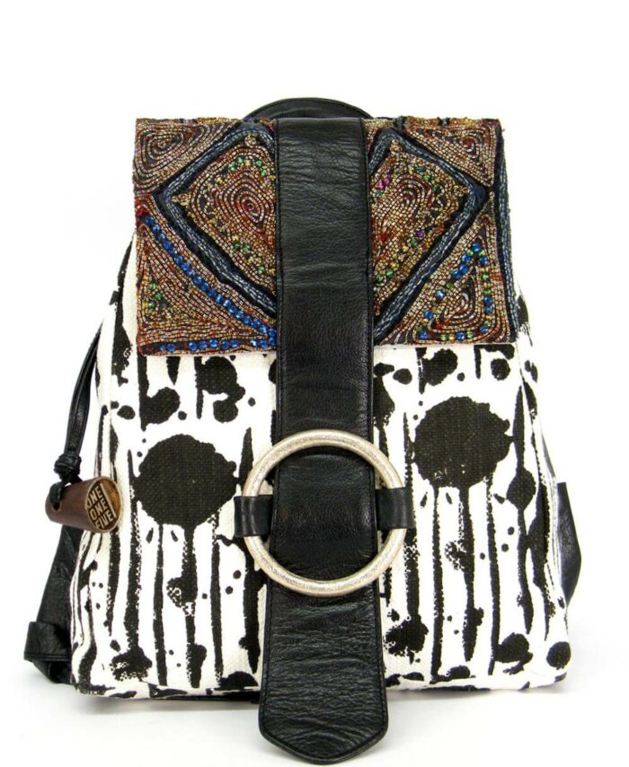 תיק גב מוהיני לבן עם הדפסים בשחור משולב בד עבודת יד מעצבת אורית לבנת הוא בדיוק אחד