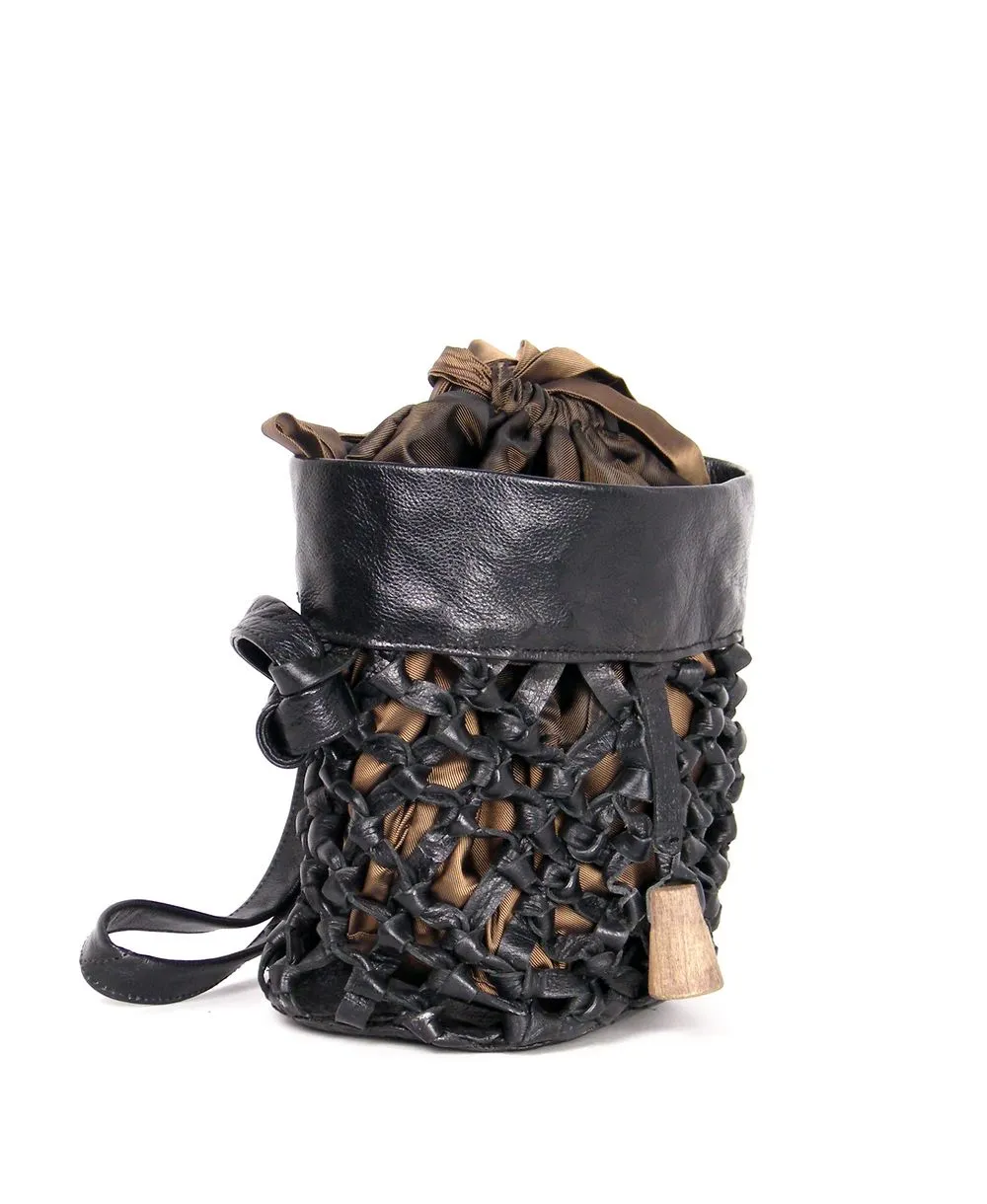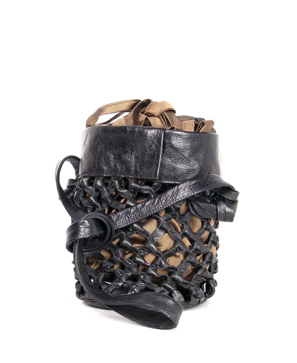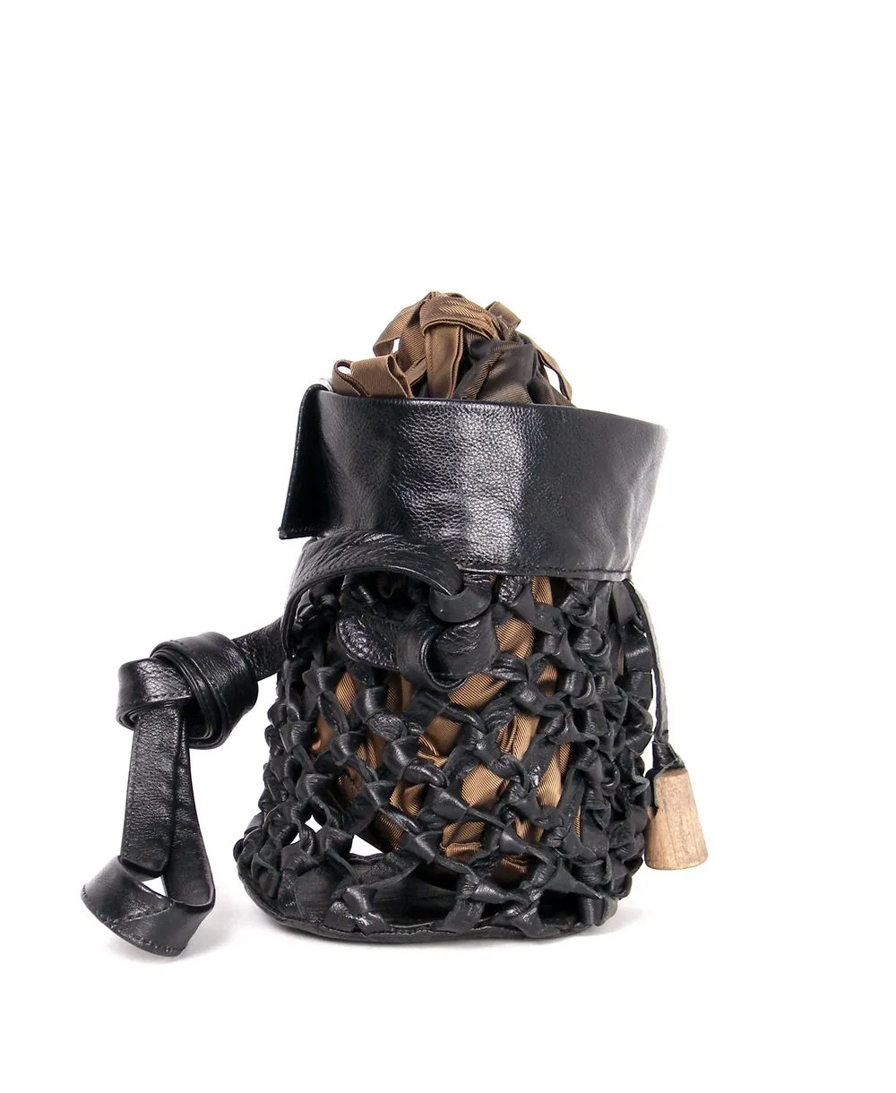 התיק עשוי עבודת יד קפדנית עם רשת עור שחור קלועה בעבודת אומן, כשבפנים שקית בד פנימית בגוון חום בגימור סאטן, הנסגרת באמצעות שרוך.