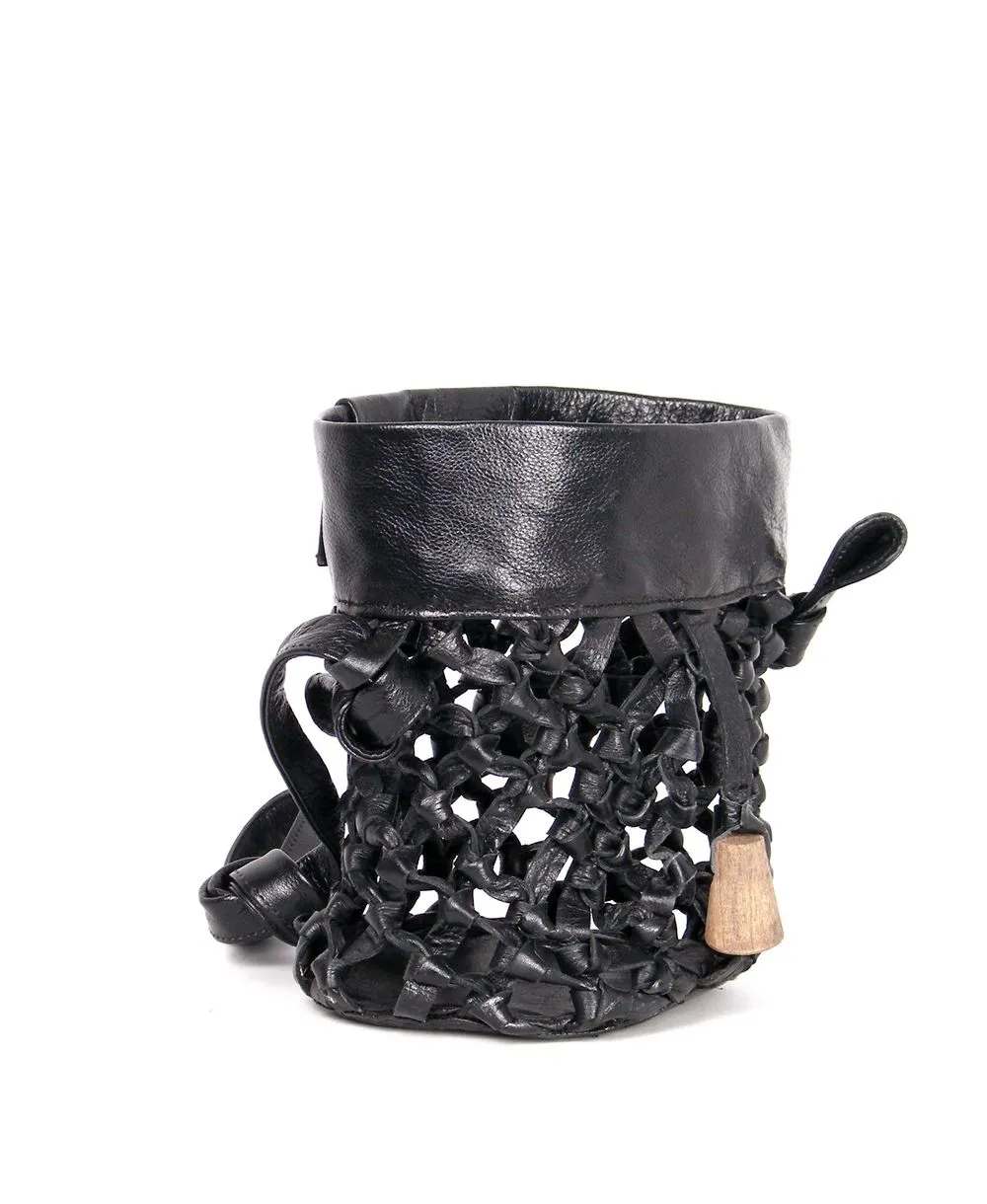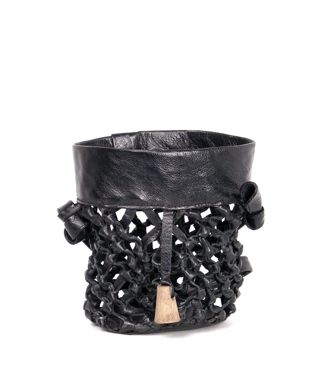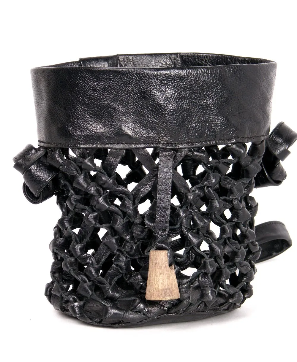 התיק עשוי עבודת יד קפדנית עם רשת עור שחור קלועה בעבודת אומן, כשבפנים שקית בד פנימית בגוון חום בגימור סאטן, הנסגרת באמצעות שרוך.
