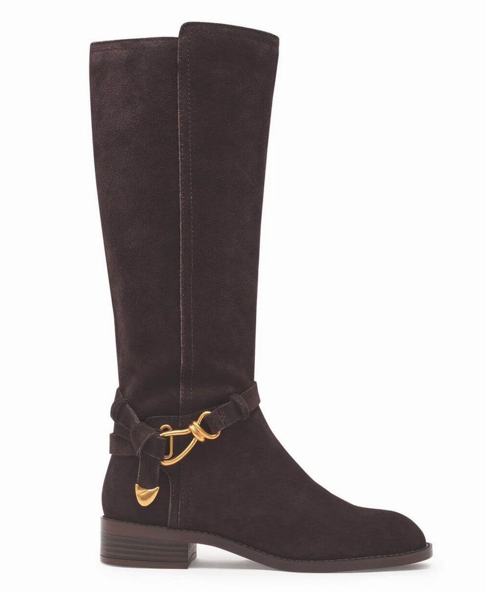 המגף עשוי עור זמש חום כהה, עם סוליה עמידה ורצועת אבזם.