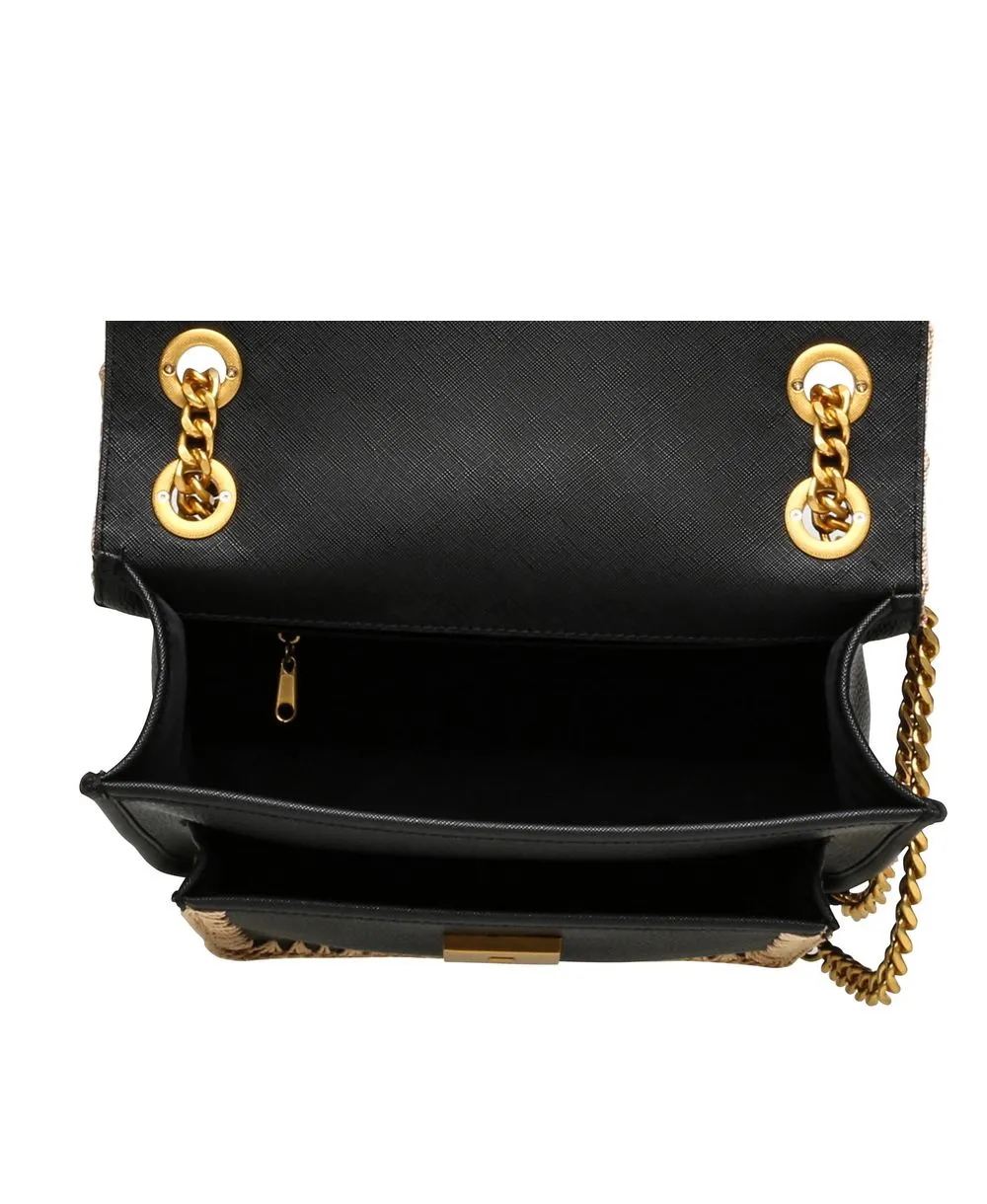 - רצועות צד משרשרת זהב וסיומת ברצועות שחור