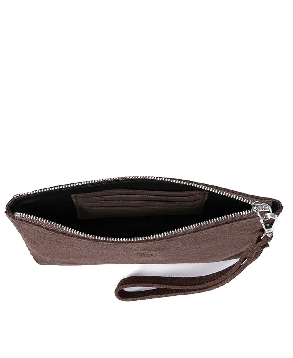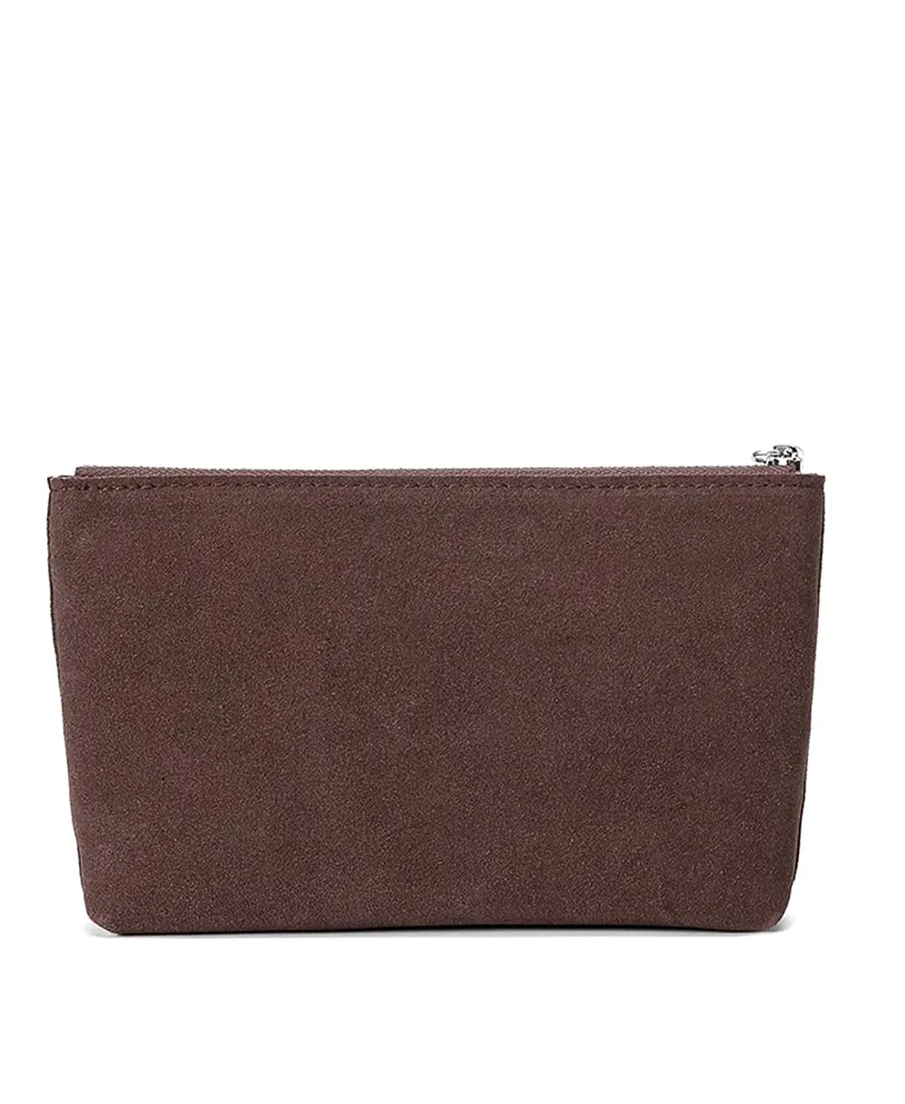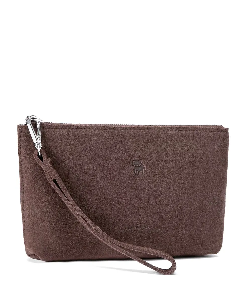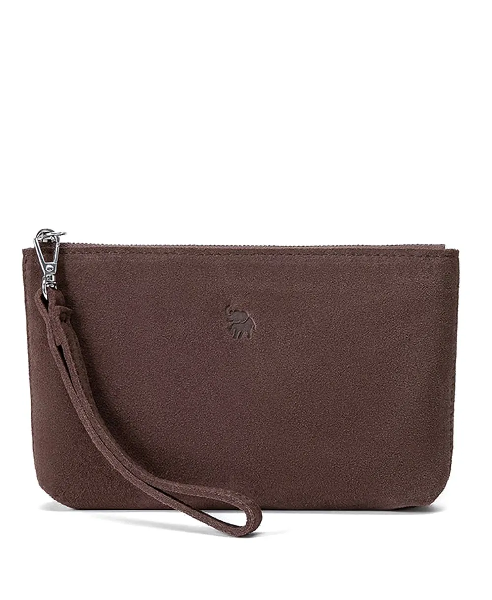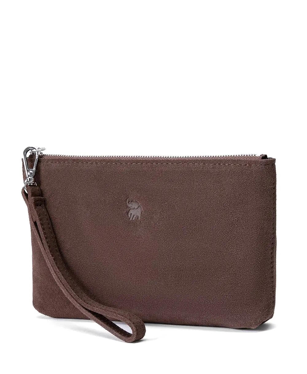 ארנק קלאץ' לנשים מעור זמש עם רצועת יד בצבע חום כהה